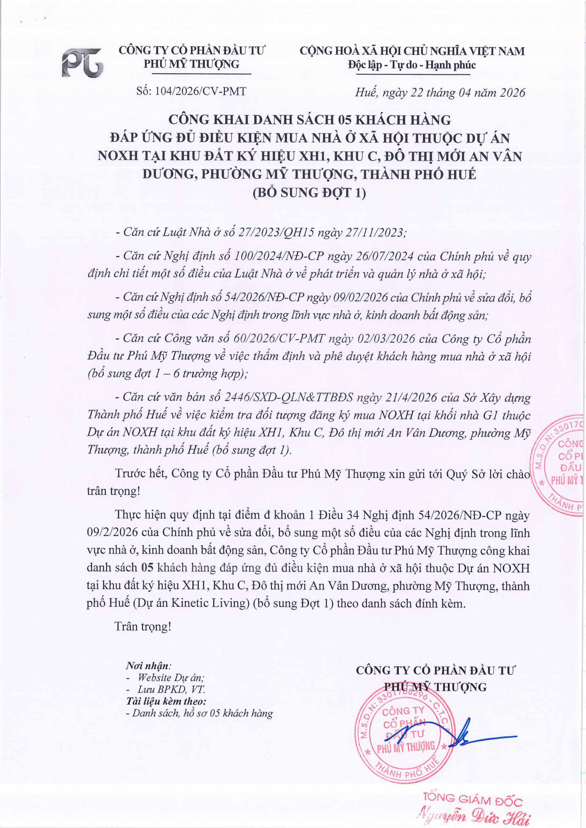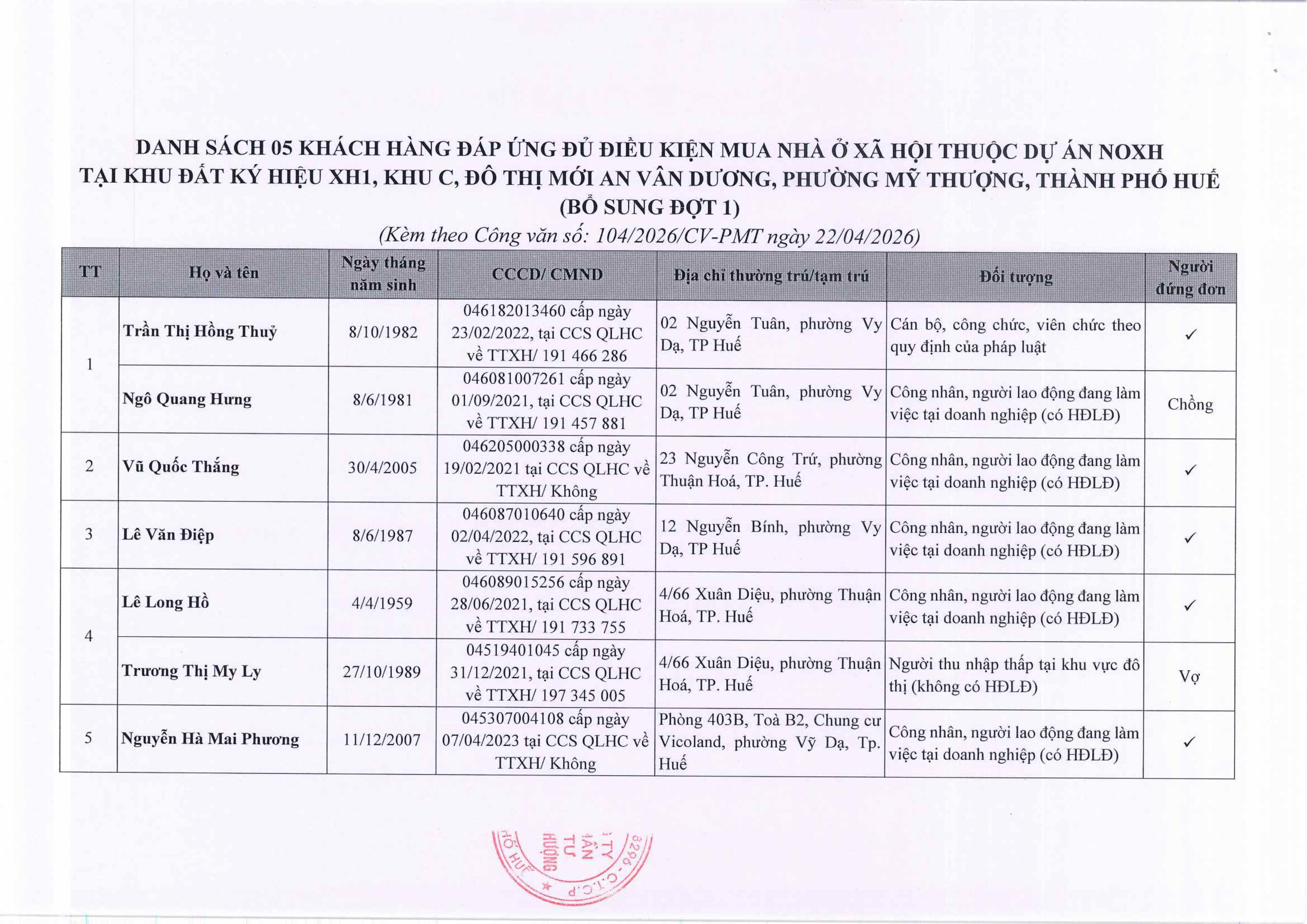 Công khai danh sách 05 khách hàng đáp ứng đủ điều kiện mua nhà ở xã hội thuộc dự án NOXH tại khu đất ký hiệu XH1, Khu C, Đô Thị Mới An Vân Dương, Phường Mỹ Thượng, Thành Phố Huế (bổ sung đợt 1).pdf